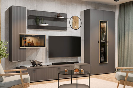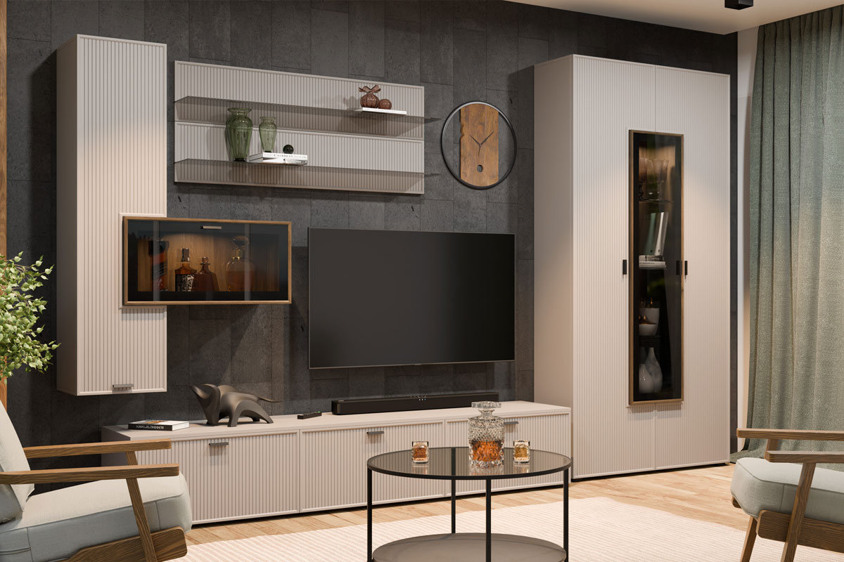 Сочетание нейтральных фоновых цветов, акцентных текстур дерева и тонированного стекла, возможность использования различных вариантов вставки являются дополнительным преимуществом этой мебели.